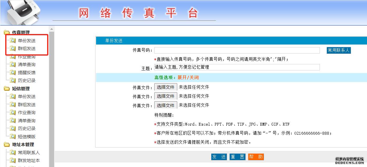 這種情況推薦使用網(wǎng)絡(luò)傳真平臺軟件系統(tǒng)。 只要電腦能上網(wǎng),無需傳真機和任何其他軟硬件,也不用占用電話線,即用電腦網(wǎng)絡(luò)發(fā)傳真;可以單份發(fā)送傳真也可以群發(fā)傳真,還可以一次發(fā)多份傳真文件。