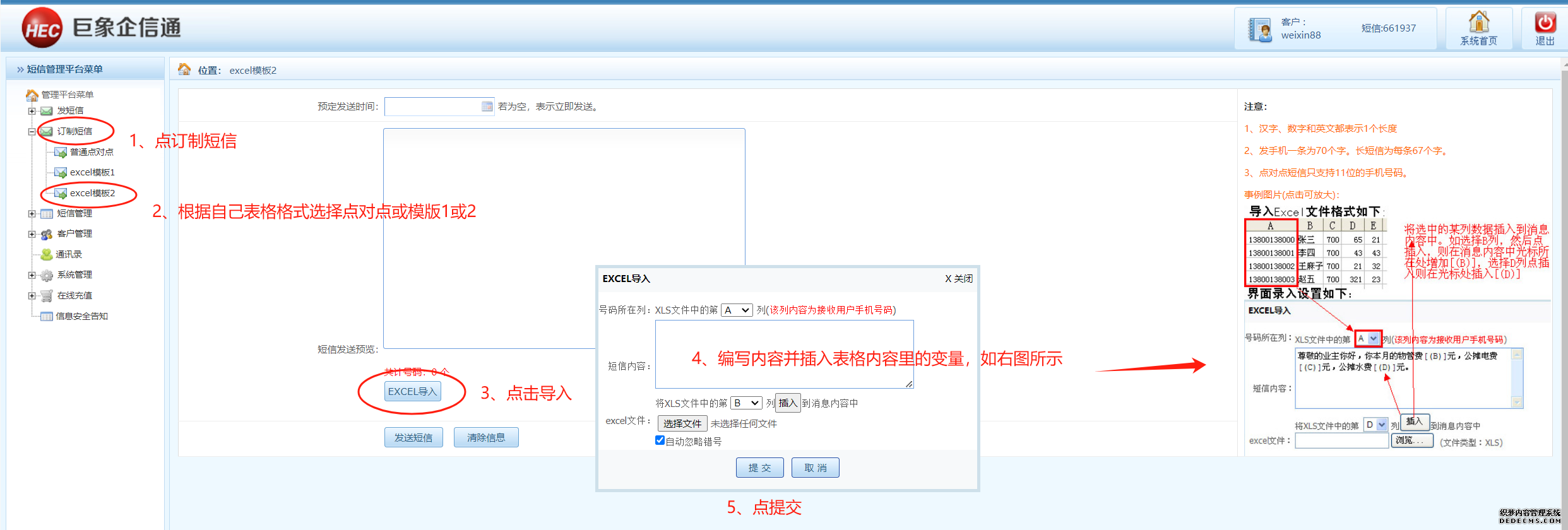 (二)個性化變量短信群發(fā)操作,即需要做到一個批次群發(fā)的手機號碼收到的內(nèi)容不完全一樣,如內(nèi)容里加入稱呼、工資條、物業(yè)費、賽事編號、座位號、學(xué)號等,如下圖所示